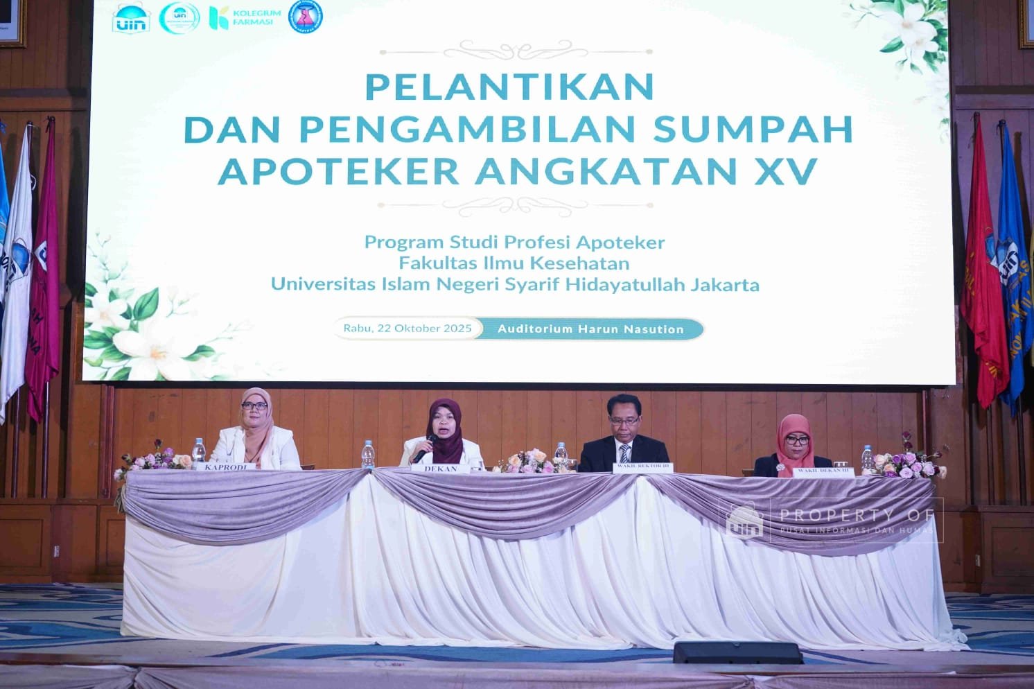 Selain para dokter, di hari yang sama, Program Studi Profesi Apoteker Fakultas Ilmu Kesehatan UIN Syarif Hidayatullah Jakarta juga menggelar pelantikan dan pengambilan sumpah apoteker Angkatan ke-15 di Auditorium Harun Nasution.