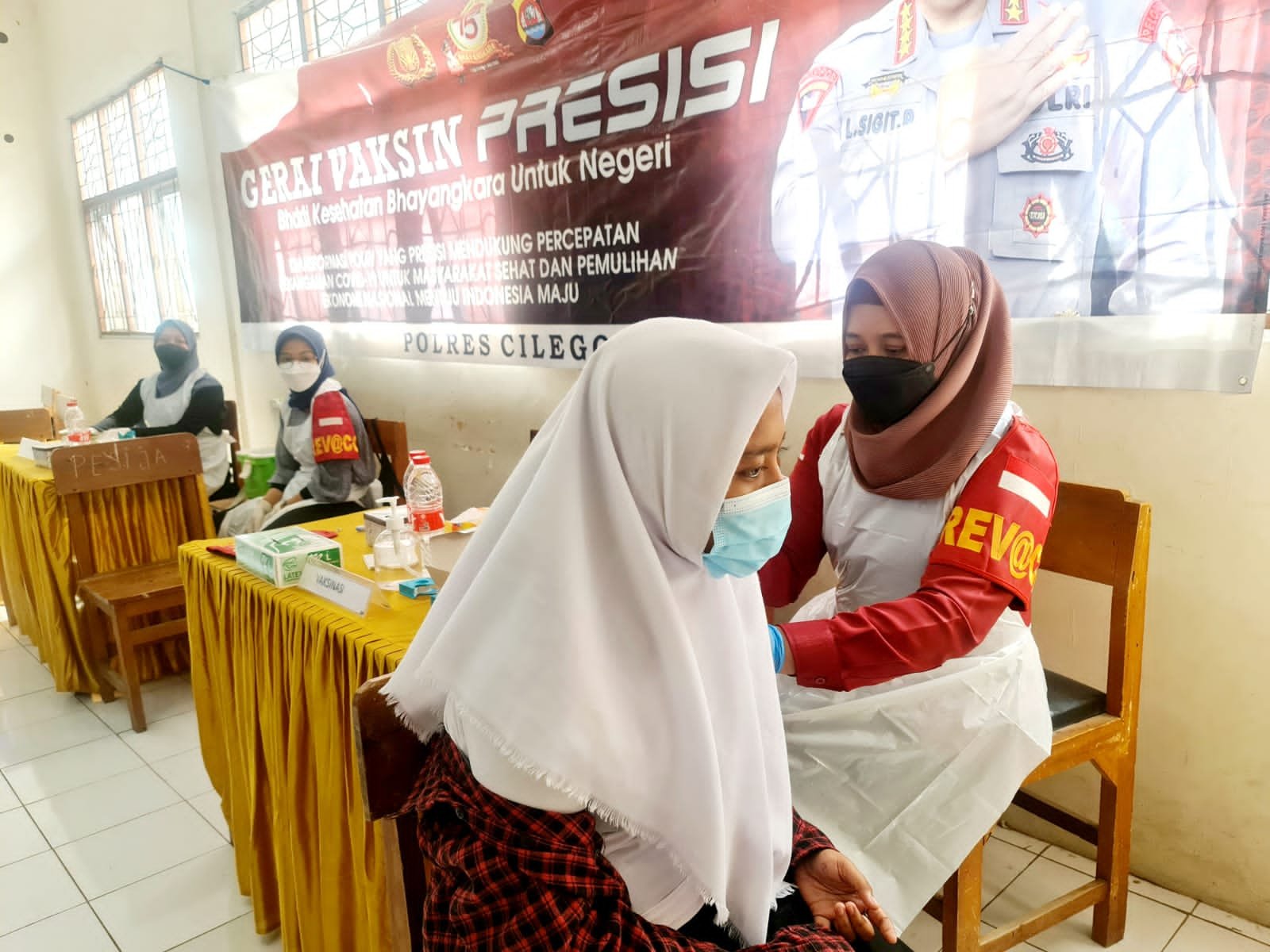 Tim Rev@co Sie Dokkes Polres Cilegon gelar Vaksinasi massal Di Gerai Vaksin Presisi TNI-POLRI kepada masyarakat Di SMKS YP 17 Cilegon kecamatan Jombang Kota Cilegon. menuju Herd Imunity.