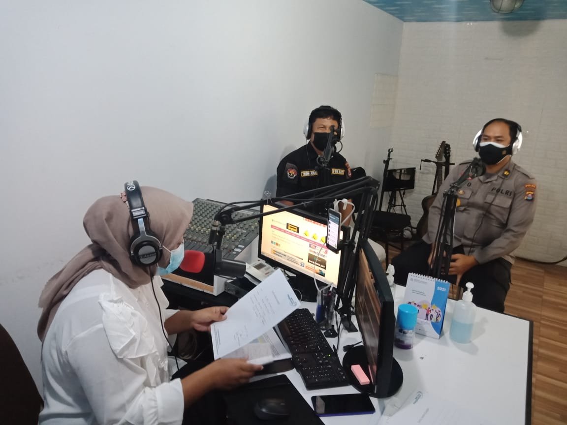 Karumkit RS Bhayangkara Polda Banten Kompol dr. Eko Yunianto,Sp.F.,MH.Kes didampingi Kaur Mitra dhp/rls/fid Polda Banten AKP E . Yudhiana mensosialisasikan program Vaksinasi masal yang dilaksanakan Polda Banten kepada masyarakat melalui media Radio Megaswara FM Serang.