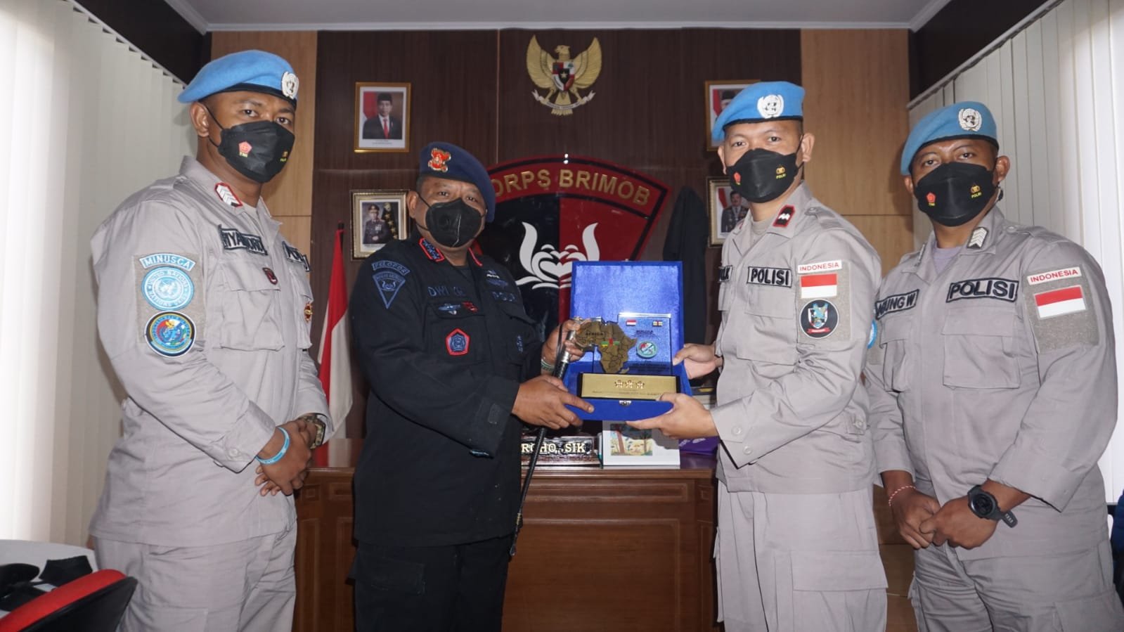 Kedatangan Satuan Tugas (Satgas) Garuda Bhayangkara FPU 3 Minusca yang berdinas di Gegana Satbrimobda Banten yaitu Aipda Budi Kurniawan dan Bripka Agung Waliadi juga personel dari Batalyon B Pelopor Satbrimobda Banten Bripka Triyantoro disambut oleh Dansat Brimob Polda Banten Kombes Pol Dwi Yanto Nugroho, S.I.K langsung di dalam ruangan kerja beliau, Selasa (19/10/2021).