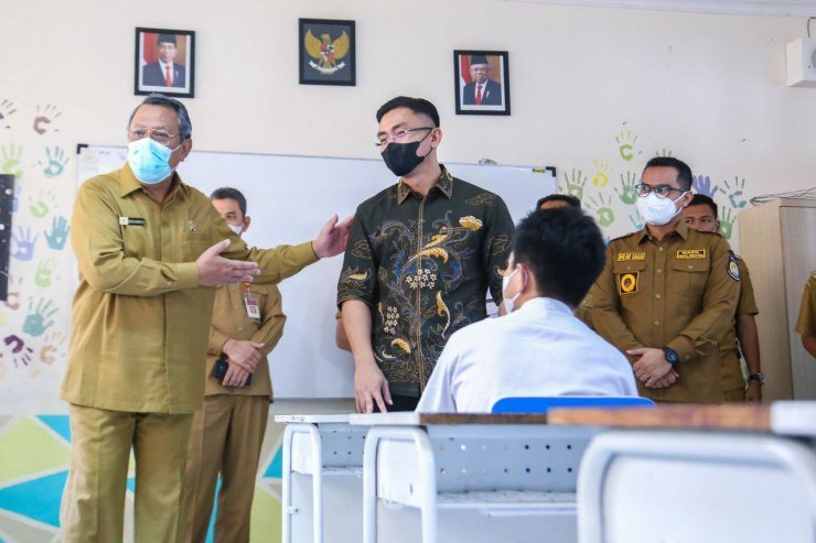 Wakil Gubenur Banten Andika Hazrumy bersama dengan Wali Kota Tangerang Selatan (Tangsel) Benyamin Davnie dan Wakil Wali Kota Tangsel Pilar Saga Ichsan meninjau sekolah dalam rangka penerapan Pembelajaran Tatap Muka (PTM) 100 persen.