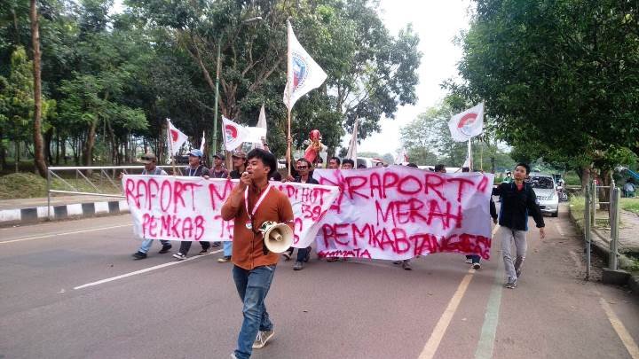 Dengan membawa spanduk bertuliskan Rapor Merah Untuk Pemkab Tangerang berorasi di depan Gedung DPRD Kabupaten Tangerang.