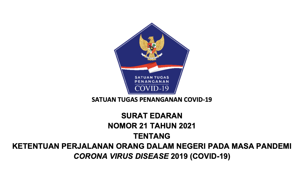 Satuan Tugas (Satgas) Penanganan COVID-19 menerbitkan Surat Edaran (SE) Nomor 21 Tahun 2021 tentang Ketentuan Perjalanan Orang Dalam Negeri dalam Masa Pandemi Corona Virus Disease 2019 (COVID-19). Edaran yang ditandatangani Ketua Satgas Penanganan COVID-19 Ganip Warsito pada tanggal 20 Oktober 2021 ini berlaku efektif mulai tanggal 21 Oktober 2021.
