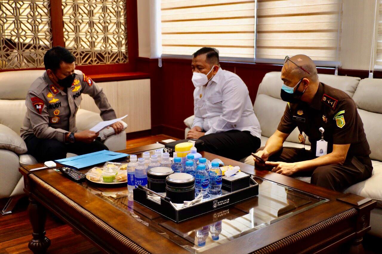 Kapolda Banten Irjen Pol Dr Rudy Heriyanto Adi Nugroho, SH., MH., MBA., menerima kunjungan Kabinda Banten Brigjen TNI Cahyono Cahya Angkasa dan Kajati Banten Reda Manthovani ke Mapolda Banten. Selasa, (10/08/2021).