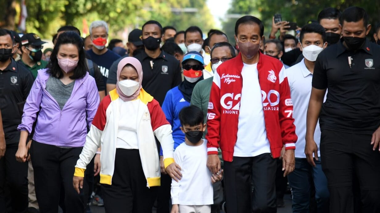 Presiden Joko Widodo dan Ibu Iriana Joko Widodo menghabiskan waktu bersama cucunya, Jan Ethes Srinarendra, dengan berjalan santai di sepanjang Jalan Slamet Riyadi, Kota Surakarta. (rls)