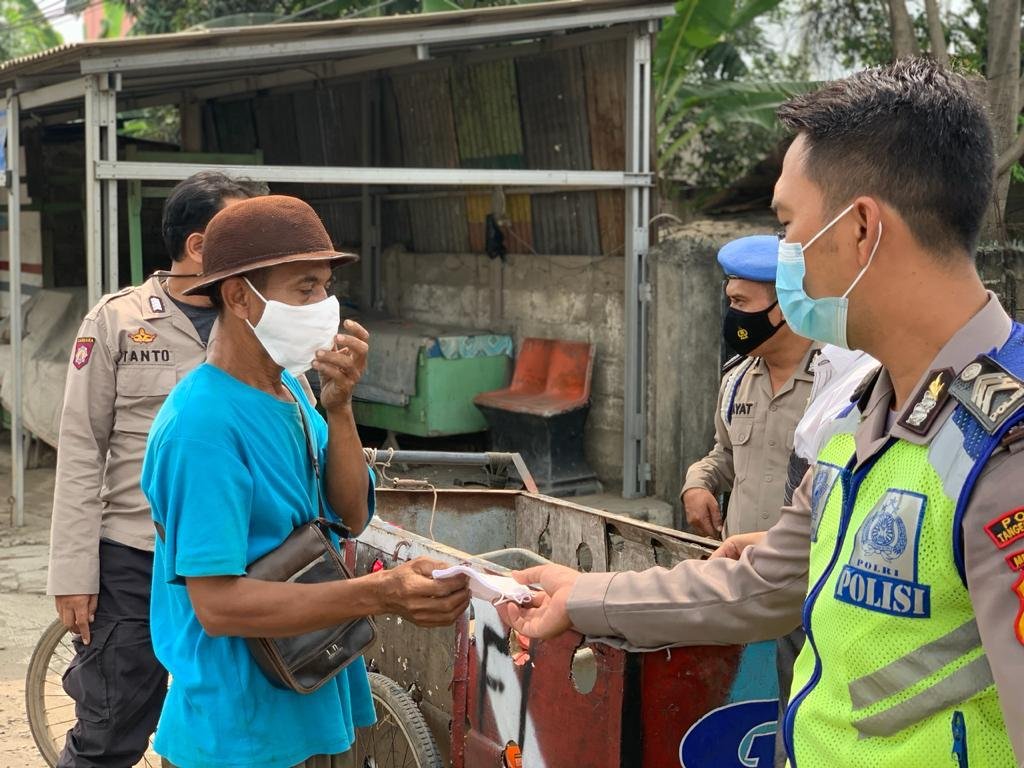 Tangerang – Cegah penyebaran Covid-19, Polres Tangerang Selatan beserta Polsek jajarannya secara rutin melaksanakan operasi yustisi dan juga membagikan masker ke masyarakat.