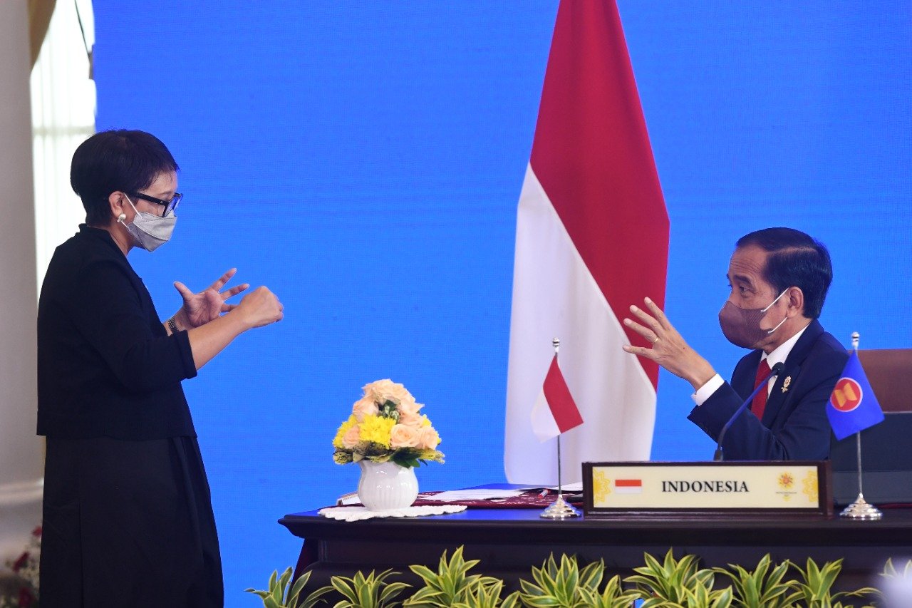 Presiden Joko Widodo berbincang dengan Menlu Retno LP Marsudi di sela rangkaian KTT ASEAN, Selasa (26/10/2021), di Istana Kepresidenan Bogor, Jabar. (Foto: BPMI Setpres/Lukas)