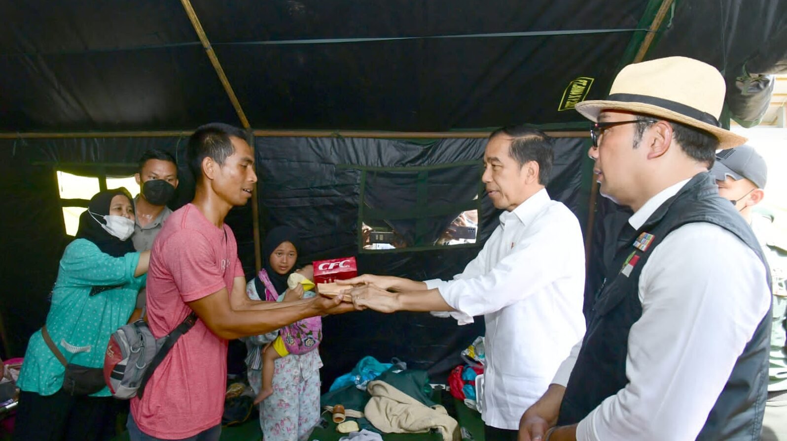 Di setiap tenda yang dikunjungi, Presiden menyapa para pengungsi, mulai dari anak-anak hingga orang tua. Bahkan, Presiden membagikan makanan siap saji kepada anak-anak yang berada di tenda pengungsian tersebut.