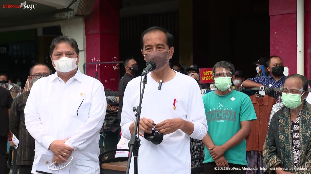 Presiden didampingi Menko Bidang Perekonomian Airlangga Hartarto memberikan sambutan pada Program BTPKLW, Sabtu (09/10/2021), di Kawasan Malioboro, Kota Yogyakarta, DIY. (Sumber: Tangkapan Layar YouTube Sekretariat Presiden)