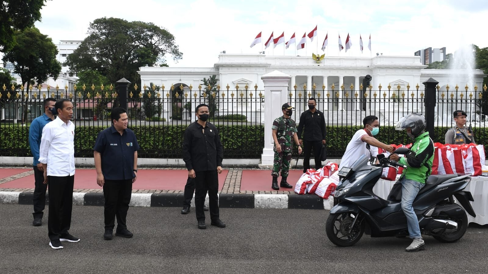 Presiden Joko Widodo menyaksikan penyerahan bantuan paket sembako bagi para pengemudi ojek daring atau ojol di sekitar Kompleks Istana Kepresidenan, Jakarta, pada Kamis, 13 April 2023. (rls)