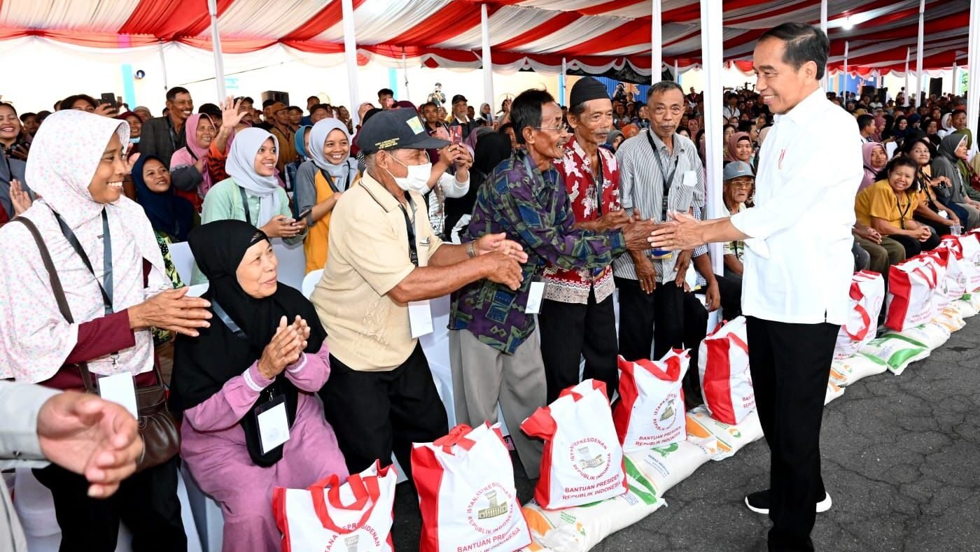 Presiden Joko Widodo menyerahkan bantuan pangan cadangan beras pemerintah (CBP) kepada masyarakat penerima manfaat di Gudang Bulog Meger, Kabupaten Klaten, Provinsi Jawa Tengah, pada Rabu, 31 Januari 2024. Saat berdialog dengan para penerima, Presiden Jokowi memastikan bahwa bantuan berupa beras 10 kilogram tersebut akan dibagikan hingga bulan Juni.