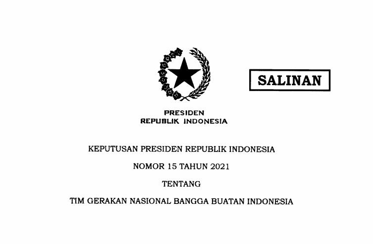 Presiden RI Joko Widodo (Jokowi) menerbitkan Keputusan Presiden Republik Indonesia (Keppres) Nomor 15 Tahun 2021 tentang Tim Gerakan Nasional Bangga Buatan Indonesia pada tanggal 8 September 2021.