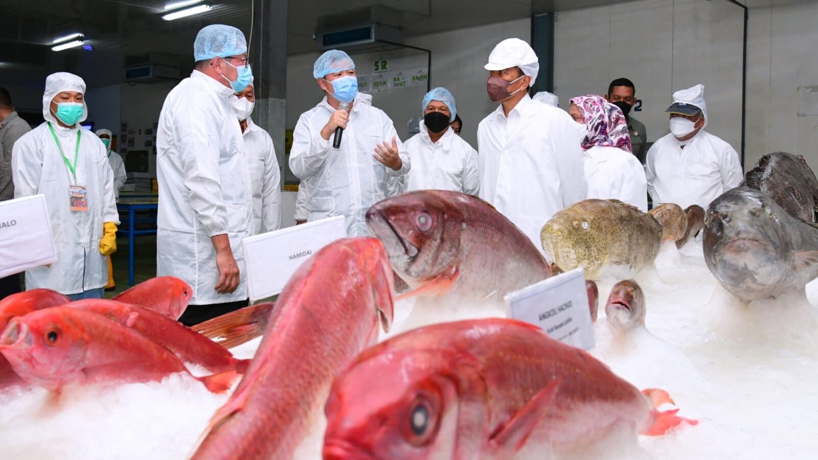 Presiden Joko Widodo dan Ibu Iriana Joko Widodo meninjau unit pengolahan ikan di PT Samudera Indo Sejahtera, Kota Tual, Rabu, 14 September 2022. Selain meninjau, Presiden juga turut berdialog dengan para nelayan dan pembudidaya rumput laut mengenai prospek pengembangan budidaya rumput laut di daerah tersebut.