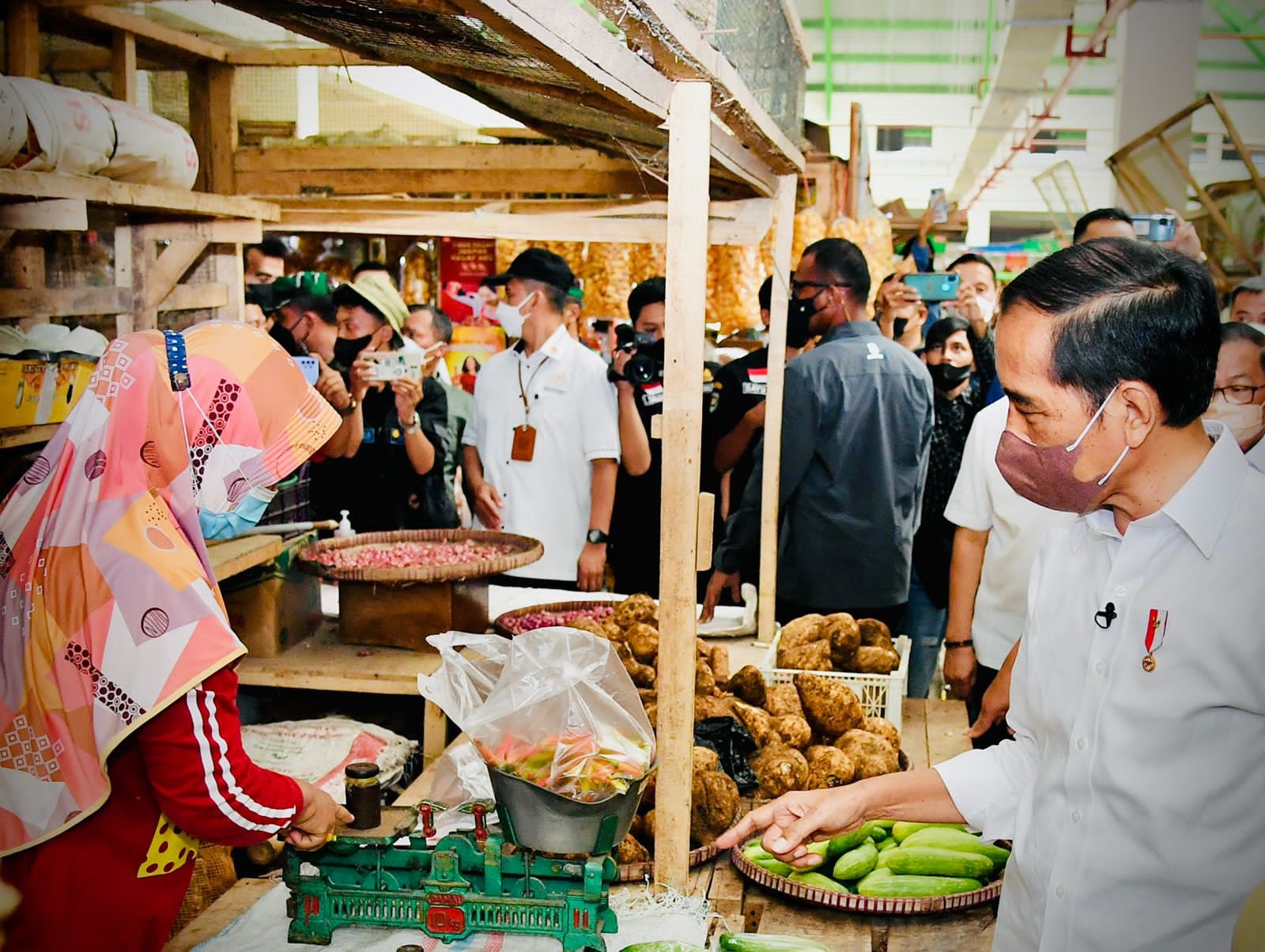 “Ini berapa harga cabai?” tanya Presiden. “Rp40.000 (1 kg),” ucap pedagang cabai. “Ya saya beli 1 kg,” kata Presiden. Ketika pedagang tersebut menyerahkan cabai, Presiden memberinya empat lembar lima puluh ribu. “Alhamdulillah, terima kasih Pak Jokowi,” kata pedagang itu sambil berseri-seri.
