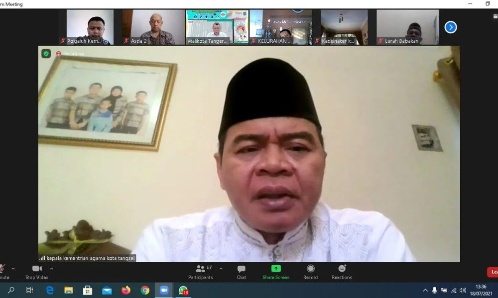 Kepala Kantor Kemenag Tangsel, Abdul Rojak, mengikuti rapat Persiapan Pengamanan Pelaksanaan Ibadah Idul Adha Tahun 1442 H/2021, Ahad (18/07/2021) yang dilaksanakan secara virtual.