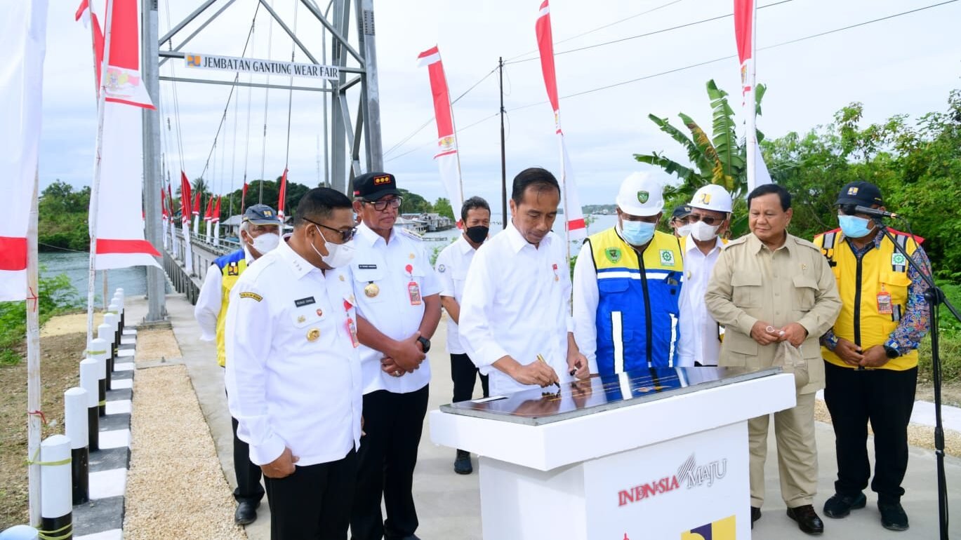 Presiden Joko Widodo didampingi Ibu Iriana Joko Widodo meresmikan Jembatan Gantung Wear Fair, dalam kunjungan kerjanya ke Kabupaten Maluku Tenggara, Provinsi Maluku, pada Rabu, 14 September 2022. Presiden menegaskan bahwa pembangunan infrastruktur berupa jembatan penting untuk mempercepat mobilitas orang dan barang.