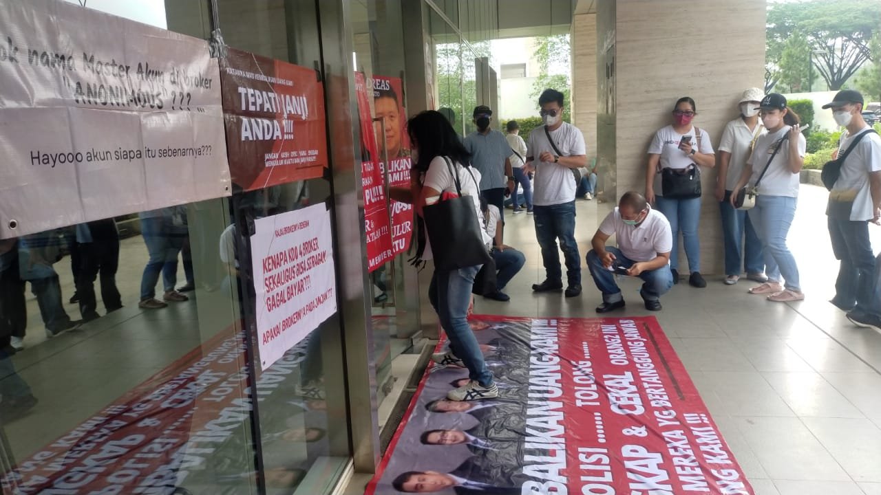 Ini merupakan aksi lanjutan Senin, (22/8/2022) lalu. Kali ini Komunitas Korban NET89 datang dengan membawa spanduk-spanduk dan poster yang diantaranya bergambar para pimpinan dari PT SMI.