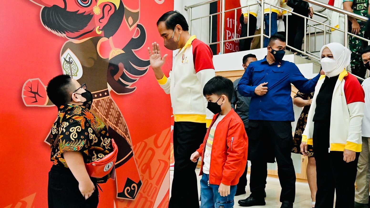 Presiden Joko Widodo didampingi Ibu Iriana Joko Widodo dan Jan Ethes Sri Narendra bertemu dengan Jovan, seorang anak berusia 9 tahun dari Kabupaten Kubu Raya, Provinsi Kalimantan Barat di Stadion Manahan, Kota Surakarta. (rls)