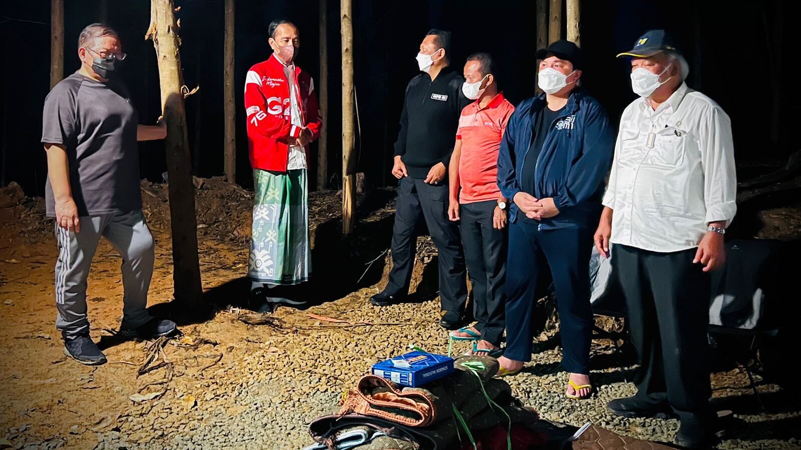 Udara sejuk dan cuaca cerah terasa pada malam hari di Ibu Kota Nusantara (IKN) di tempat Presiden Joko Widodo bermalam, Senin, 14 Maret 2022. Presiden Jokowi yang tampak mengenakan jaket merah bermotif G20 dan sarung bermotif kotak keluar dari tenda tempatnya bermalam sekitar pukul 22.15 WITA.