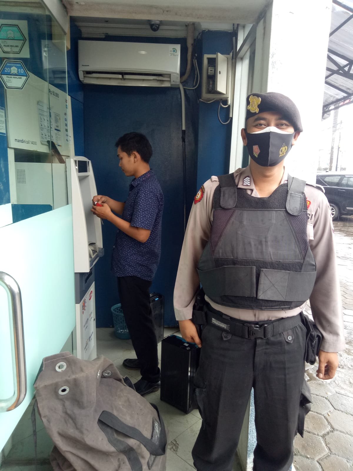 Personel Satsamapta Polres Serang Bripka Radius laksanakan pengawalan Pengisian Anjungan Tunai Mandiri (ATM) oleh PT UG MANDIRI Jumat, 19/11/2021.