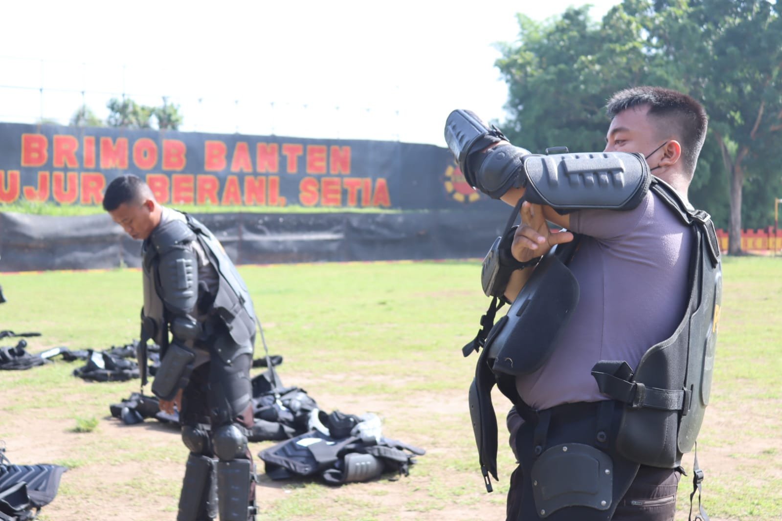 Satbrimob Polda Banten melaksanakan pengecekan peralatan untuk antisipasi aksi unjuk rasa yang akan dilaksanakan di KP3B Provinsi Banten pada Rabu (05/01) besok.