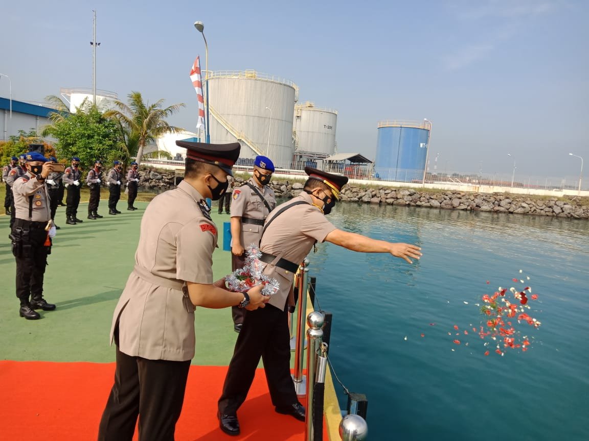 Untuk mengenang jasa para pahlawan, jajaran Kepolisian Daerah (Polda) Banten melakukan tabur bunga di perairan sekitar Dermaga Sultan Ageng Tirtayasa Ditpolairud Polda Banten di Merak Kota Cilegon. Selasa, (29/06/2021).