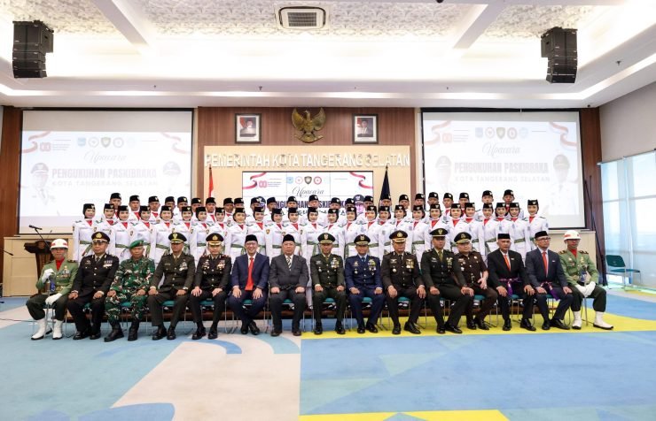 Wali Kota Benyamin Davnie mengukuhkan Pasukan Pengibar Bendera Pusaka (Paskibraka) Kota Tangerang Selatan tahun 2025. Acara pengukuhan Paskibraka berlasung di Aula Blandongan, Puspemkot Tangsel. Jumat (15/08/2025).